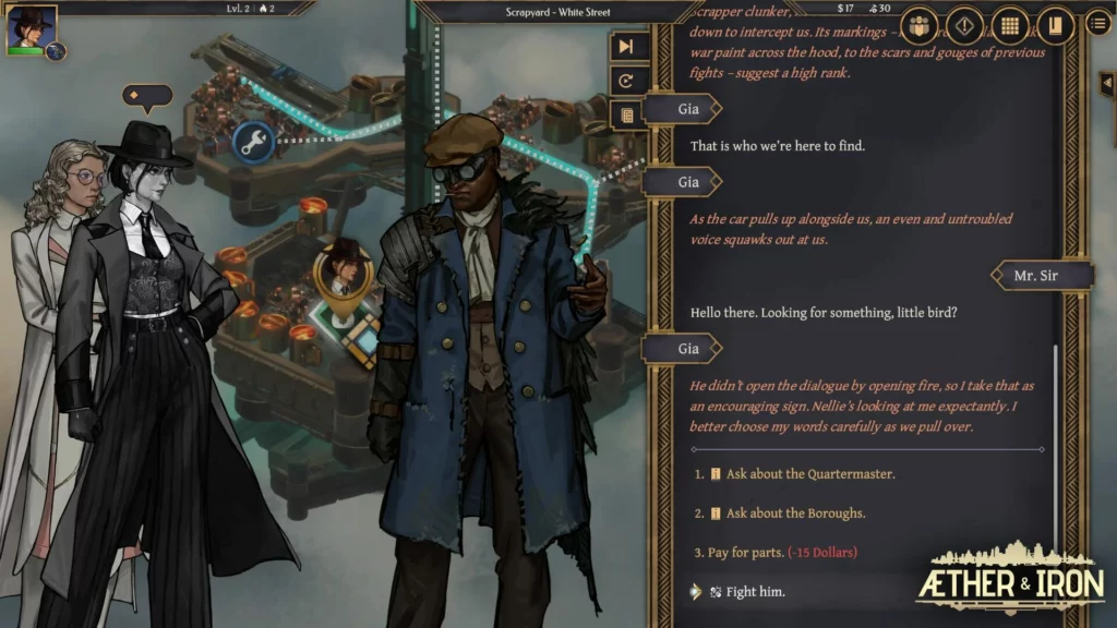 – Visuais fascinantes: inspirado nos quadrinhos de detetives dos anos 1930 e no período Art Déco, Aether & Iron apresenta uma identidade visual única.