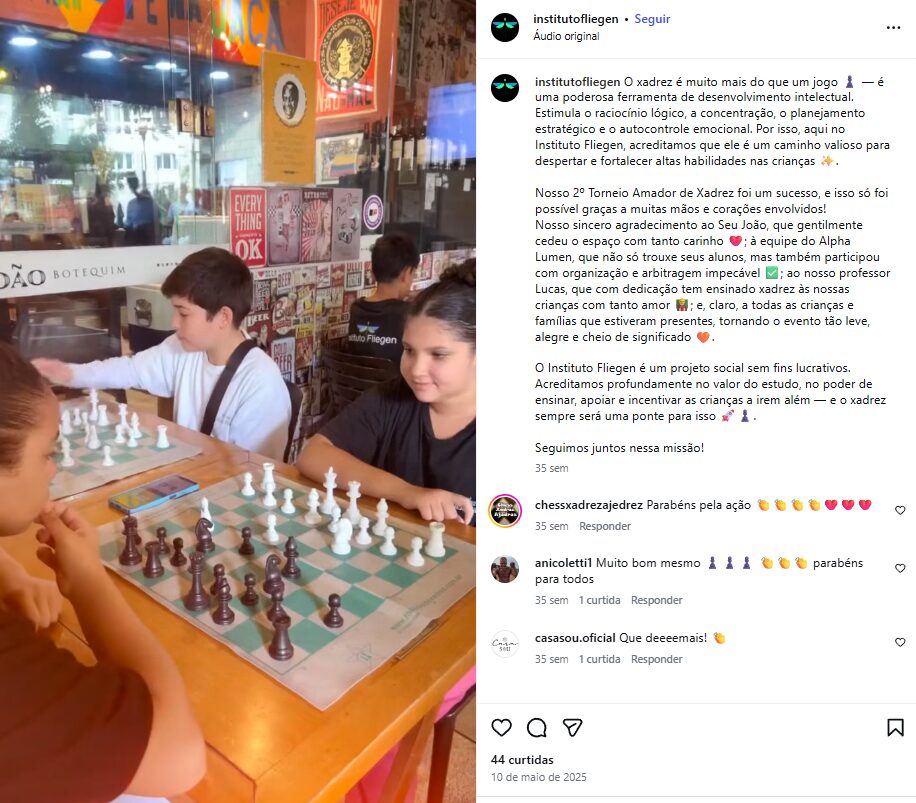 O Instituto Fliegen está usando lições de jogo de xadrez, matemática, física e astronomia para ajudar a virar alguns jogos na vida de jovens em situação de vulnerabilidade social em Cotia-SP, região metropolitana de São Paulo.